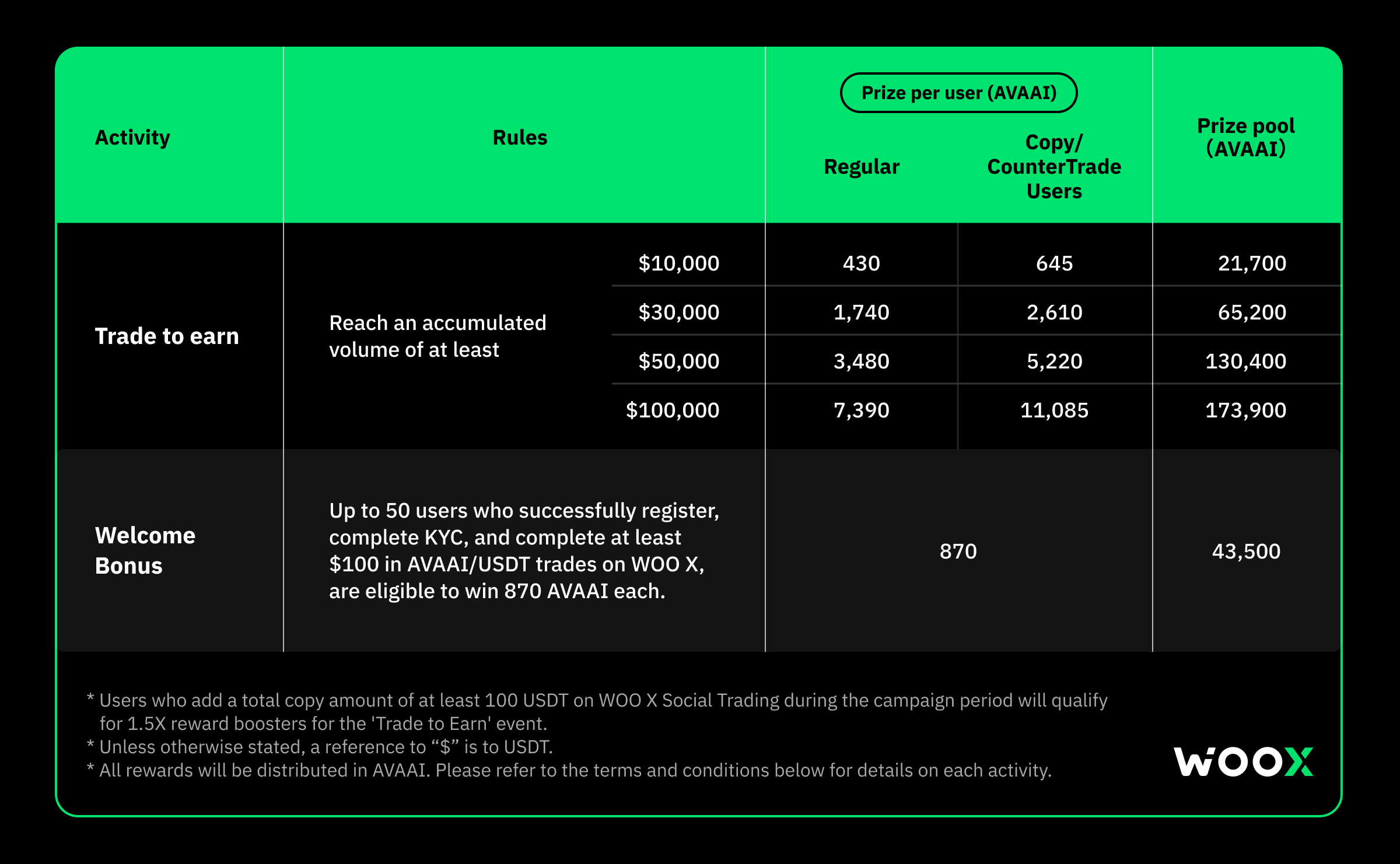 - All users who complete AVAAI trades, and meet the specific trading volume requirements indicated in the table above on WOO X during the activity period are eligible to share the stated prize pools.