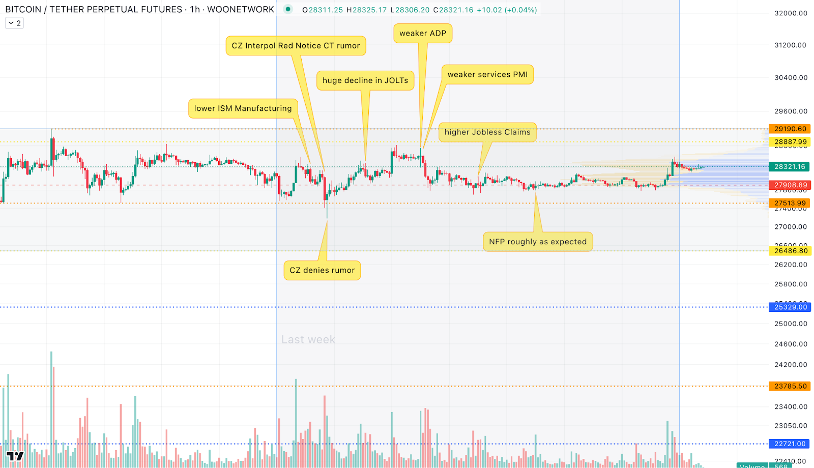 Исключением стал разве что понедельник, когда первая криптовалюта установила локальный минимум в зоне 27 180 долларов. Это произошло вслед за публикацией данных об индексе деловой активности в производственном секторе (PMI) США от ISM, а также из-за слухов о возможном розыске руководителя Binance Чанпена Чжао представителями Интерпола. Впрочем, Чанпен опроверг слухи, в результате чего рынок выдал краткосрочное восстановление.