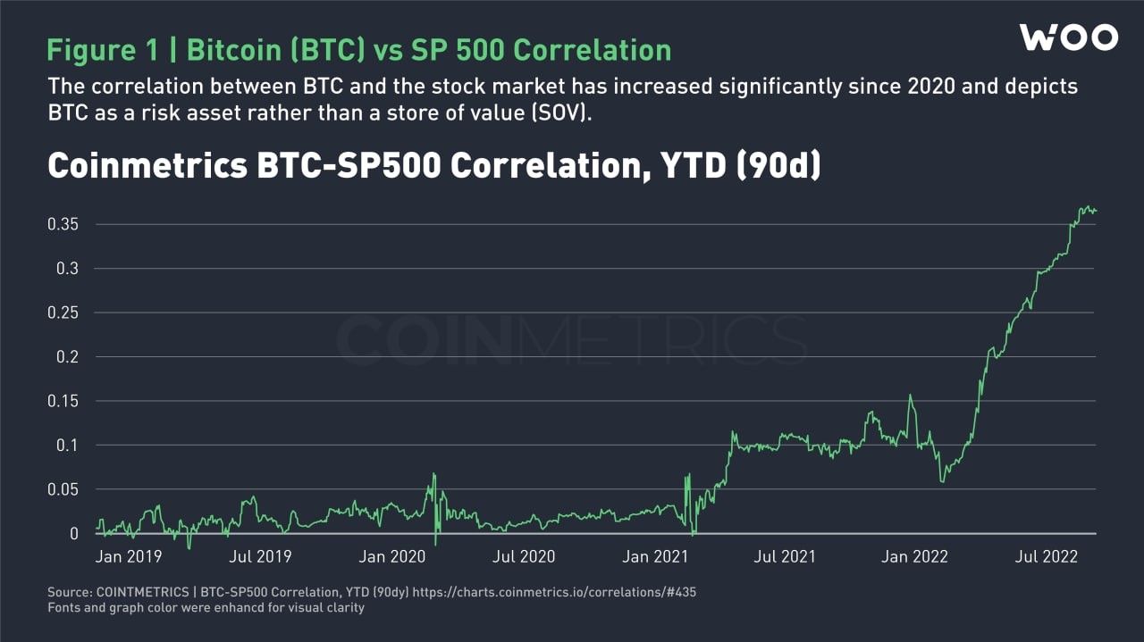 Последнее десятилетие наглядно доказало, что восприятие Биткойна в качестве средства сбережения или “цифрового золота 21-го века”, как предсказывали ранние любители криптовалют, себя не оправдало. Всё же корреляция между курсом BTC и стоимостью акций технологических компаний довольна высока, поэтому к Биткойну относятся прежде всего как к рискованному активу.