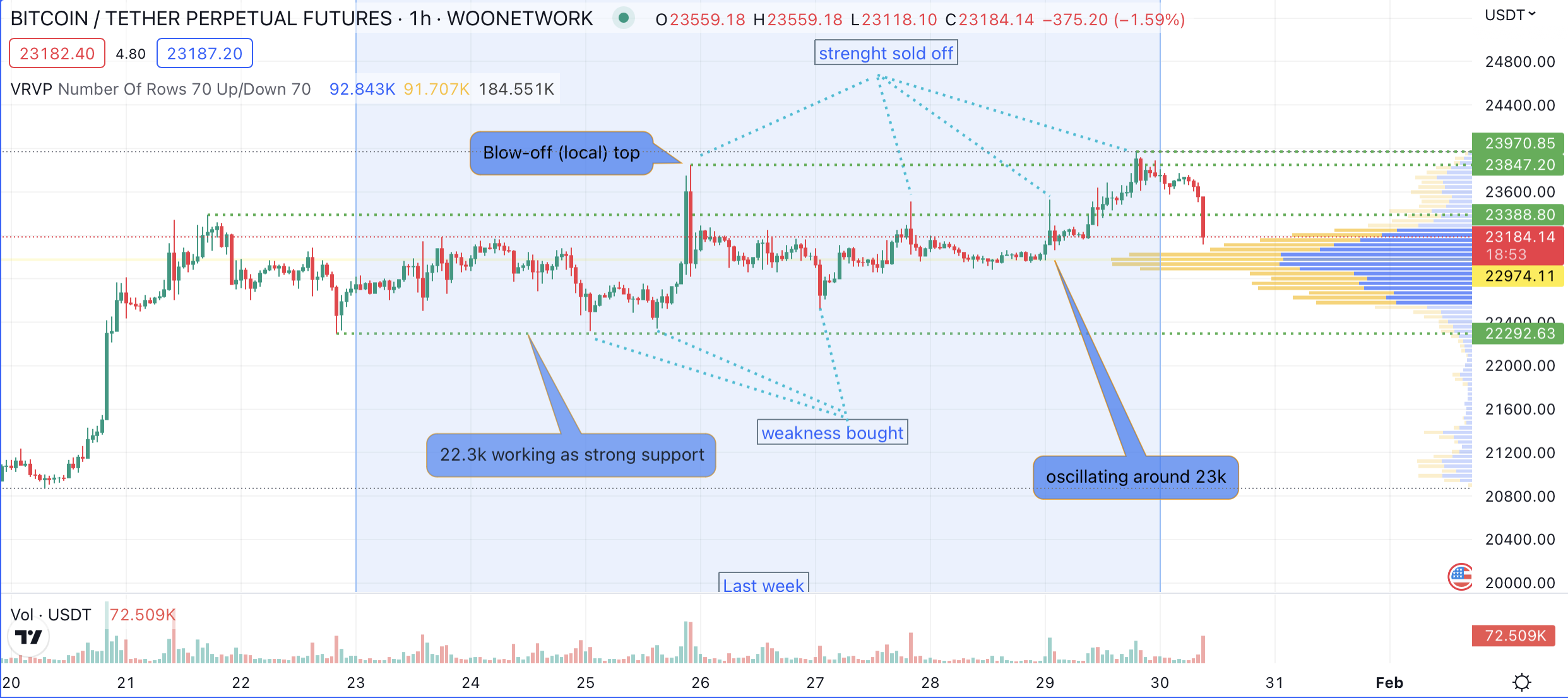 В последние недели в движении $BTC мало что изменилось. После двух этапов роста цены в этом году мы остались в консолидации. Воскресный минимум в 22,300 долларов сработал как сильная поддержка, которую агрессивно покупали.