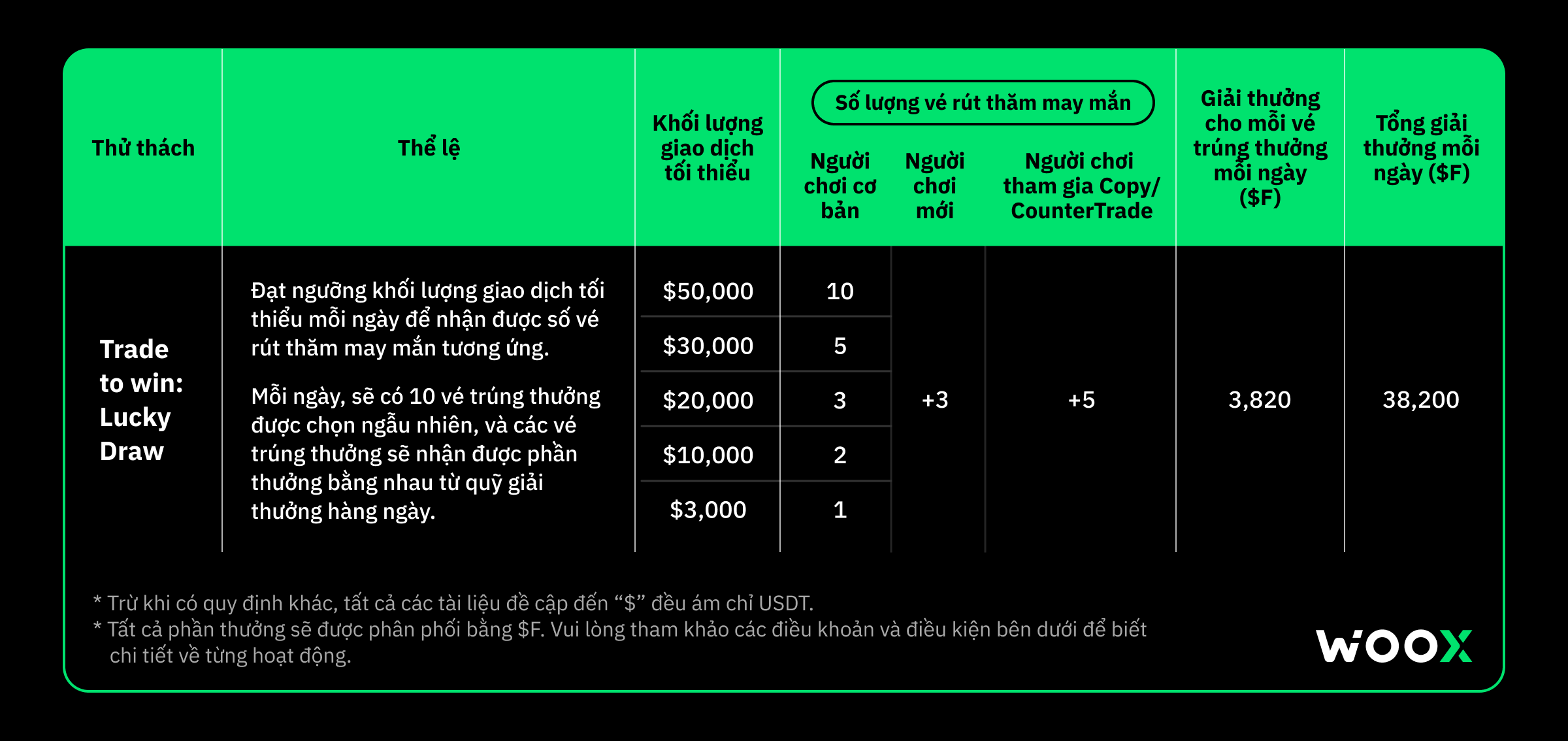 - Người dùng phân bổ ít nhất 300 USDT vào lệnh Copy/CounterTrade trên WOO X Social Trading trong thời gian diễn ra chương trình sẽ nhận được 5 vé thưởng kể từ ngày phân bổ.