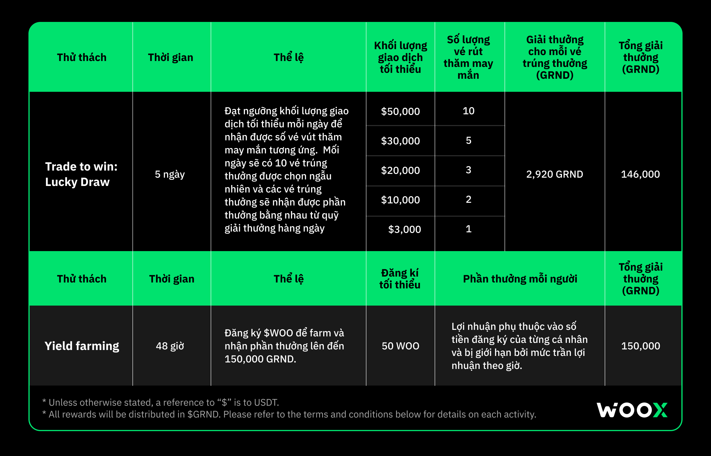 - Đăng ký vào kho yield farming GRND bằng WOO để farm lợi nhuận từ tổng giải thưởng khổng lồ 150.000 GRND. Tất cả lợi nhuận sẽ được phân phối bằng GRND.
