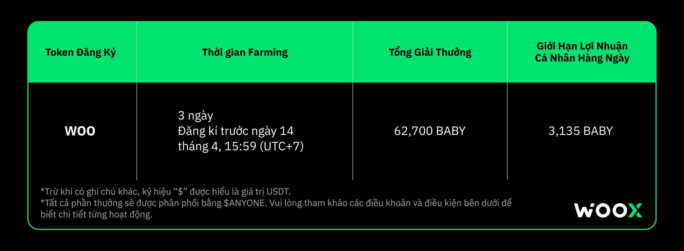 - Tham gia: Đăng ký tham gia vault Yield Farming BABY bằng WOO để khai thác lợi nhuận từ tổng giải thưởng khổng lồ 62,700 BABY. Tất cả lợi nhuận sẽ được phân phối bằng BABY.