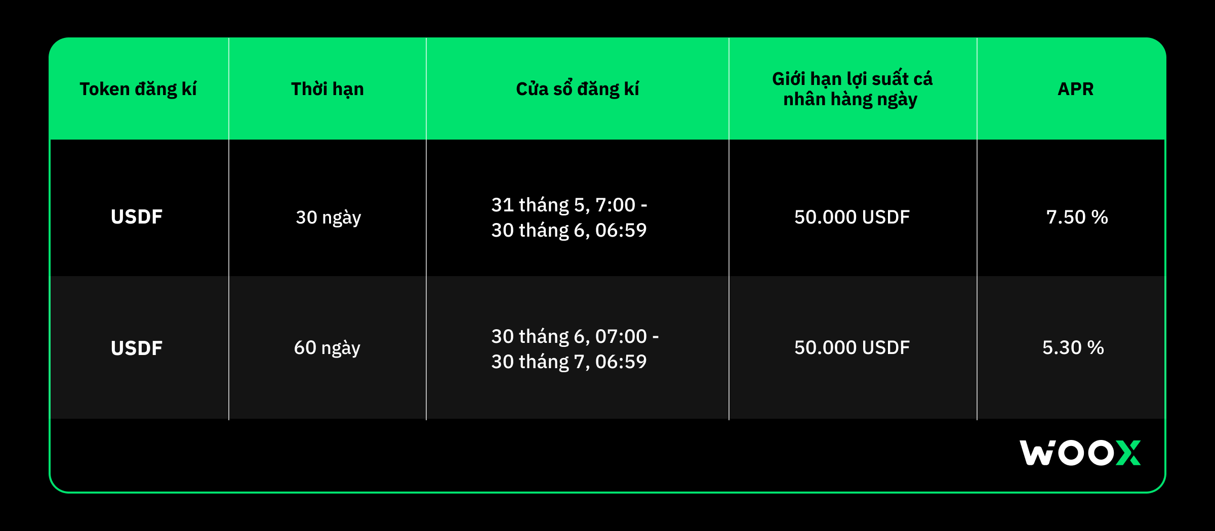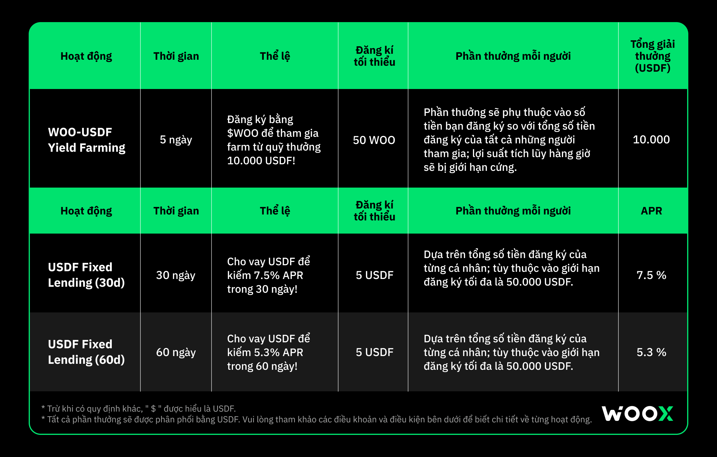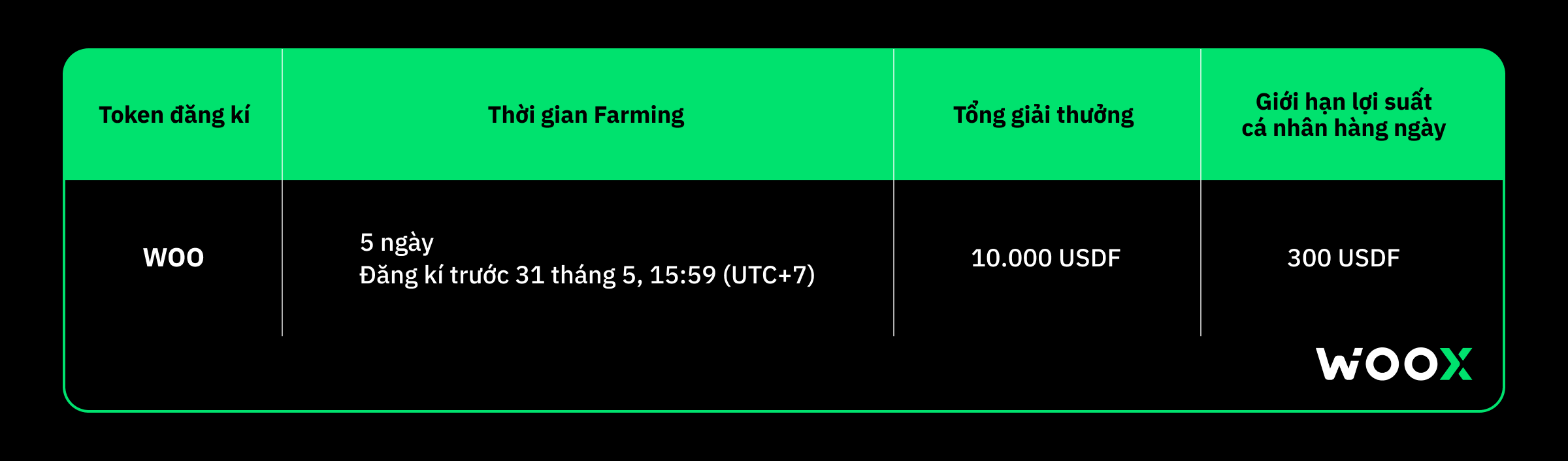• Cửa sổ đăng ký WOO-USDF sẽ mở vào 17:00 ngày 26 tháng 5 và đóng vào 15:59 ngày 31 tháng 5. Tất cả lợi suất tích lũy trong thời gian farming sẽ được thanh toán ngay sau 17:59 ngày 31 tháng 5 khi giai đoạn farming kết thúc.