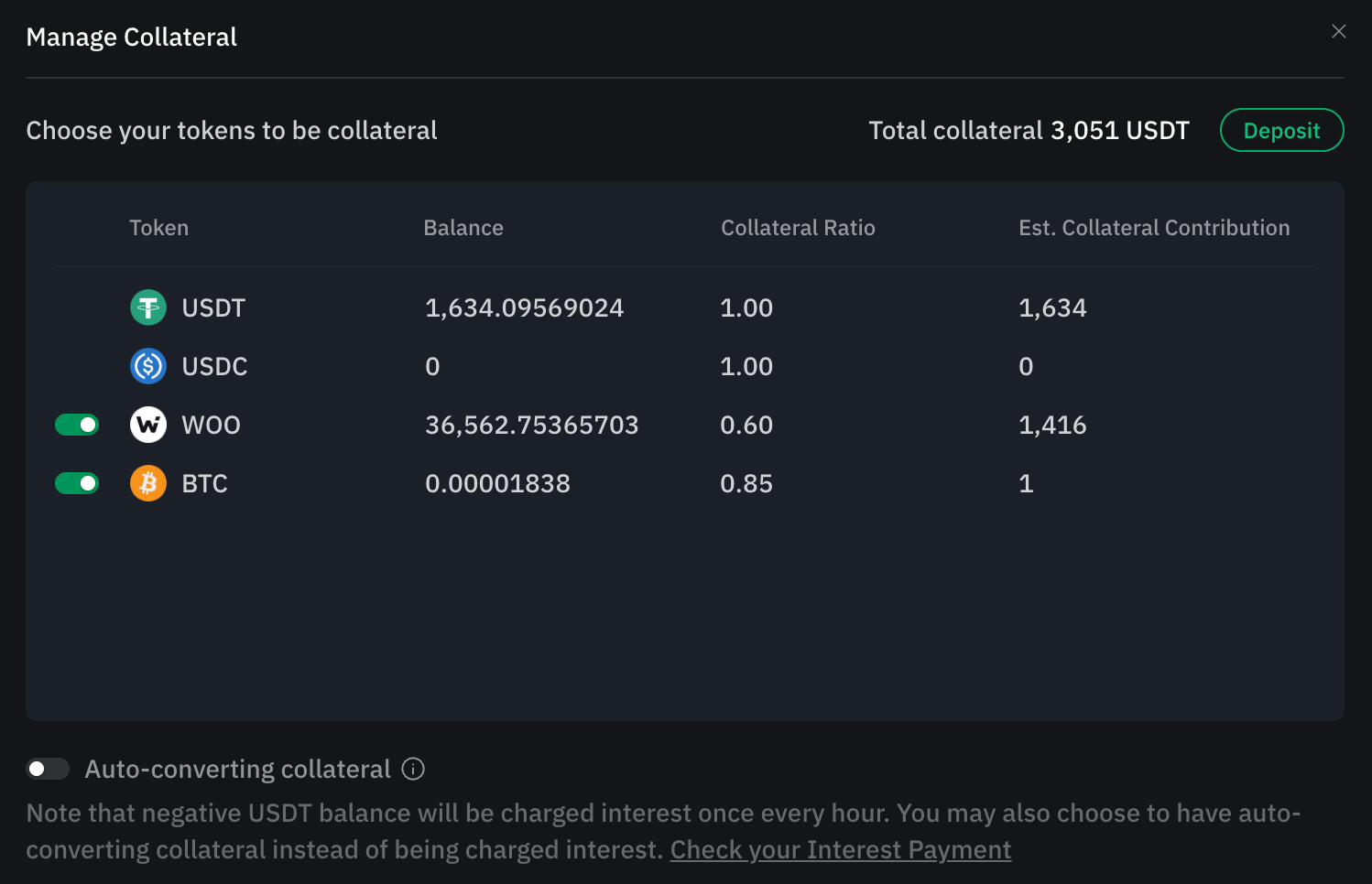 Cuối cùng, người dùng WOO X có thể hưởng lợi từ cài đặt quản lý tài sản thế chấp có thể truy cập trực tiếp thông qua tài khoản của bạn, sau đó nhấp vào nút "Quản lý tài sản thế chấp" (Manage collateral).