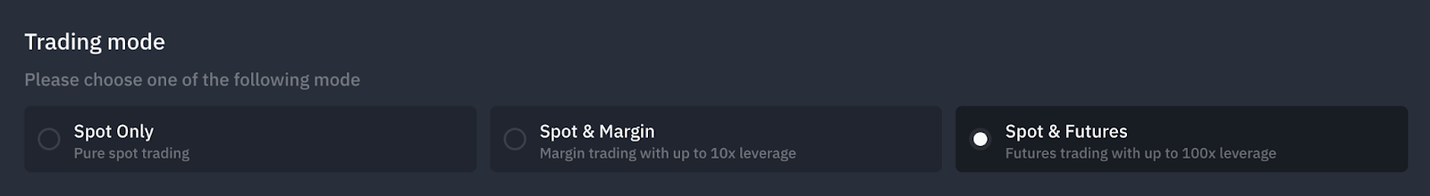 Người dùng WOO X có thể chọn chế độ giao dịch ưa thích và dễ dàng chuyển đổi giữa Chỉ Giao Dịch Spot (Spot Only), Spot & Margin và Spot & Futures. Các tùy chọn này có sẵn từ bảng điều khiển chế độ giao dịch.