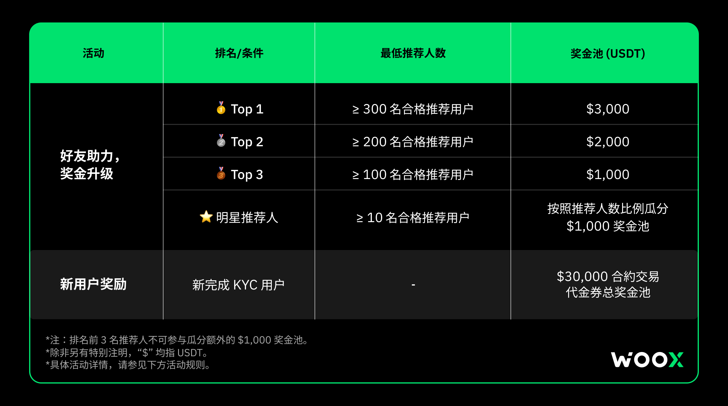 - 所有奖励的发放均需符合相关法律法规的规定。若受法律或监管要求限制,WOO X 保留延迟、暂停或取消发放奖励的权利。