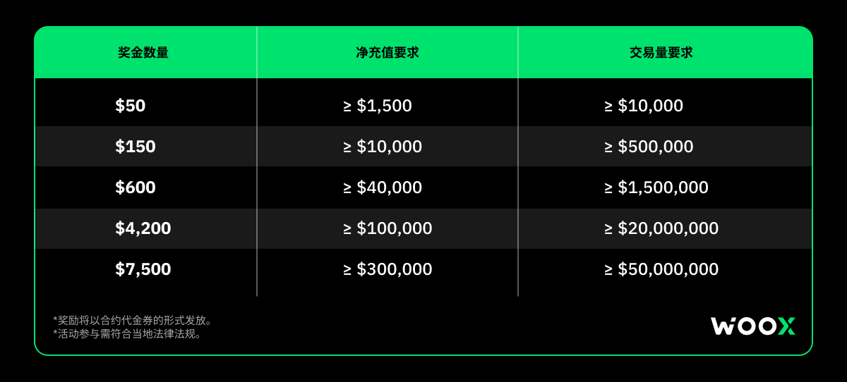 - 为了获得奖金,您必须在 14 天的活动窗口期内满足上述充值和交易量要求。只有同时满足这两个条件才能获得奖励。单独满足其中一个条件将无法解锁奖励。