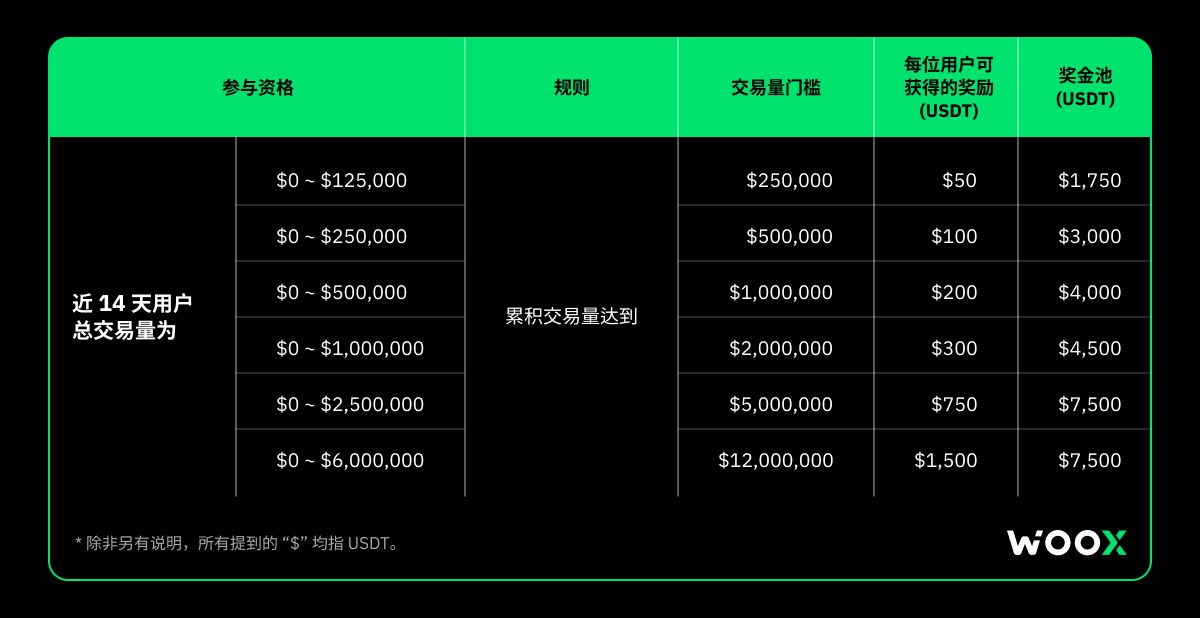 - 活动期间内,所有在 WOO X 达到上述表格中所示总交易量要求的用户,均有资格分享相应的 USDT 奖金池。