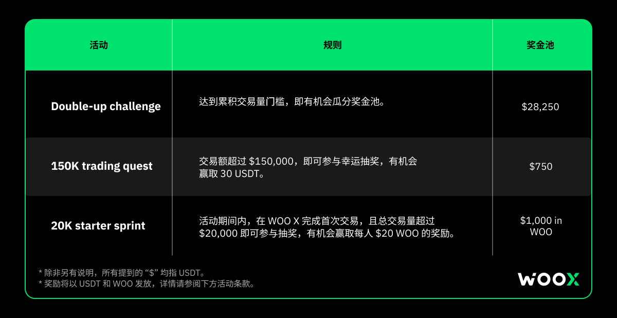 - WOO X 保留在无提前通知的情况下随时修改、暂停或终止本次活动的权利,包括调整活动时间和奖金分配。