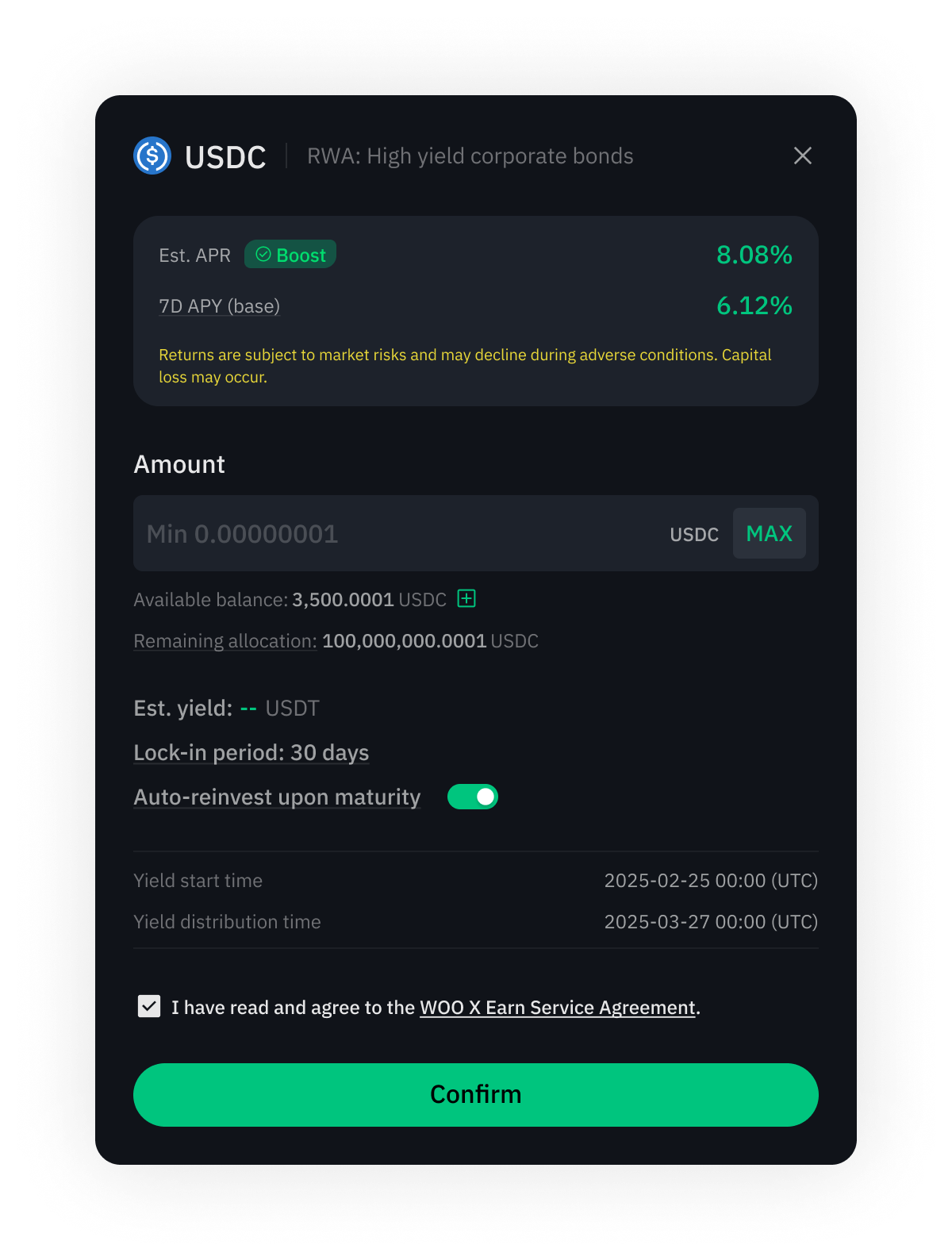 • 无限存款额度: 与许多交易所限制稳定币存款不同,Earn WOO X上的 RWA 允许您无限制地投资,意味着您可以在没有任何限制的情况下最大化收益潜力。