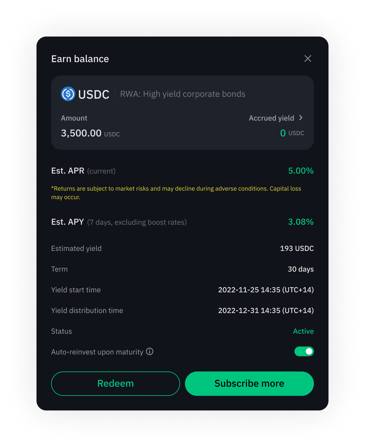 • 自动复利: Vault 会每日支付 USDC 收益,并自动将利息进行复利操作。