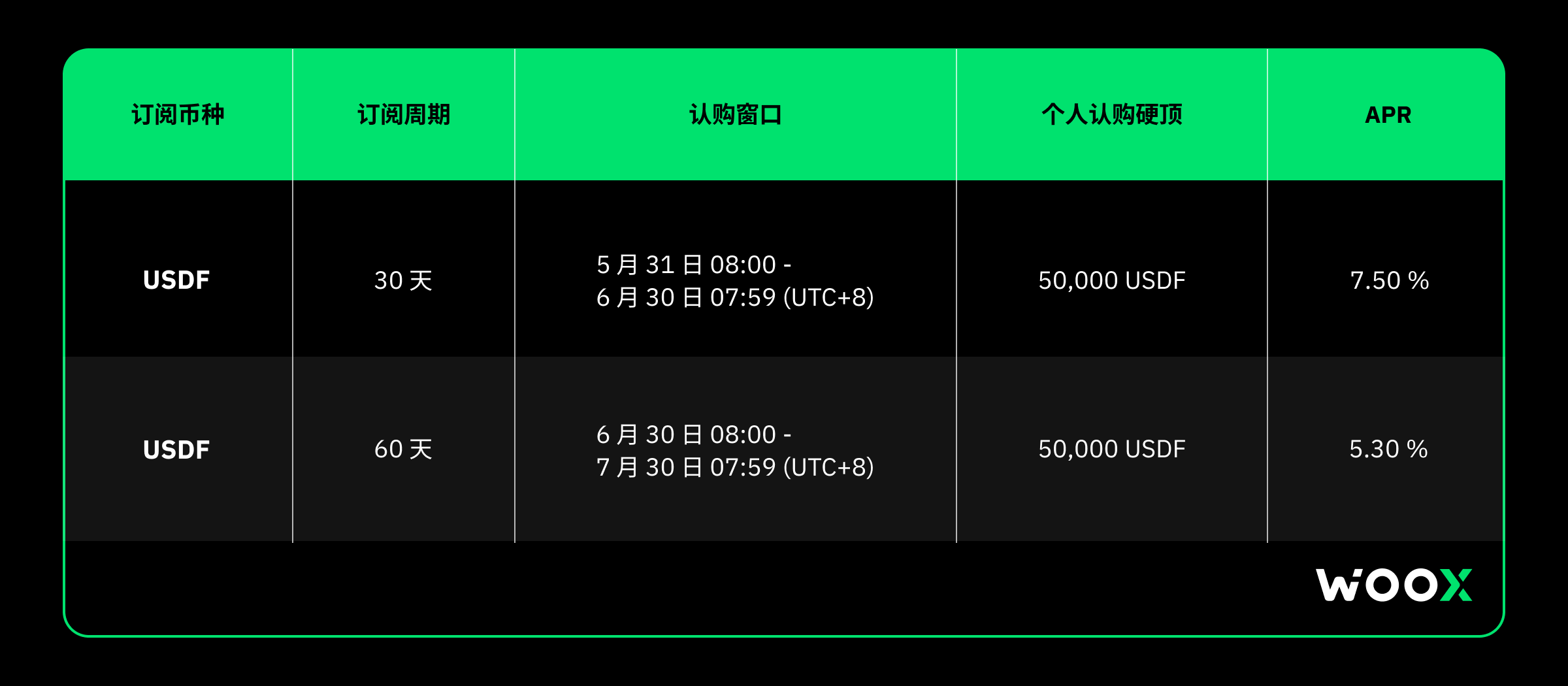 • 认购窗口将在 6 月 30 日 08:00 UTC+8 开启,并于 7 月 30 日 07:59 UTC 关闭。累计收益将在各自到期日的 08:15 UTC+8 结算,并与相应认购的本金一起支付,到期日为认购开始每日积累收益后的 60 天。