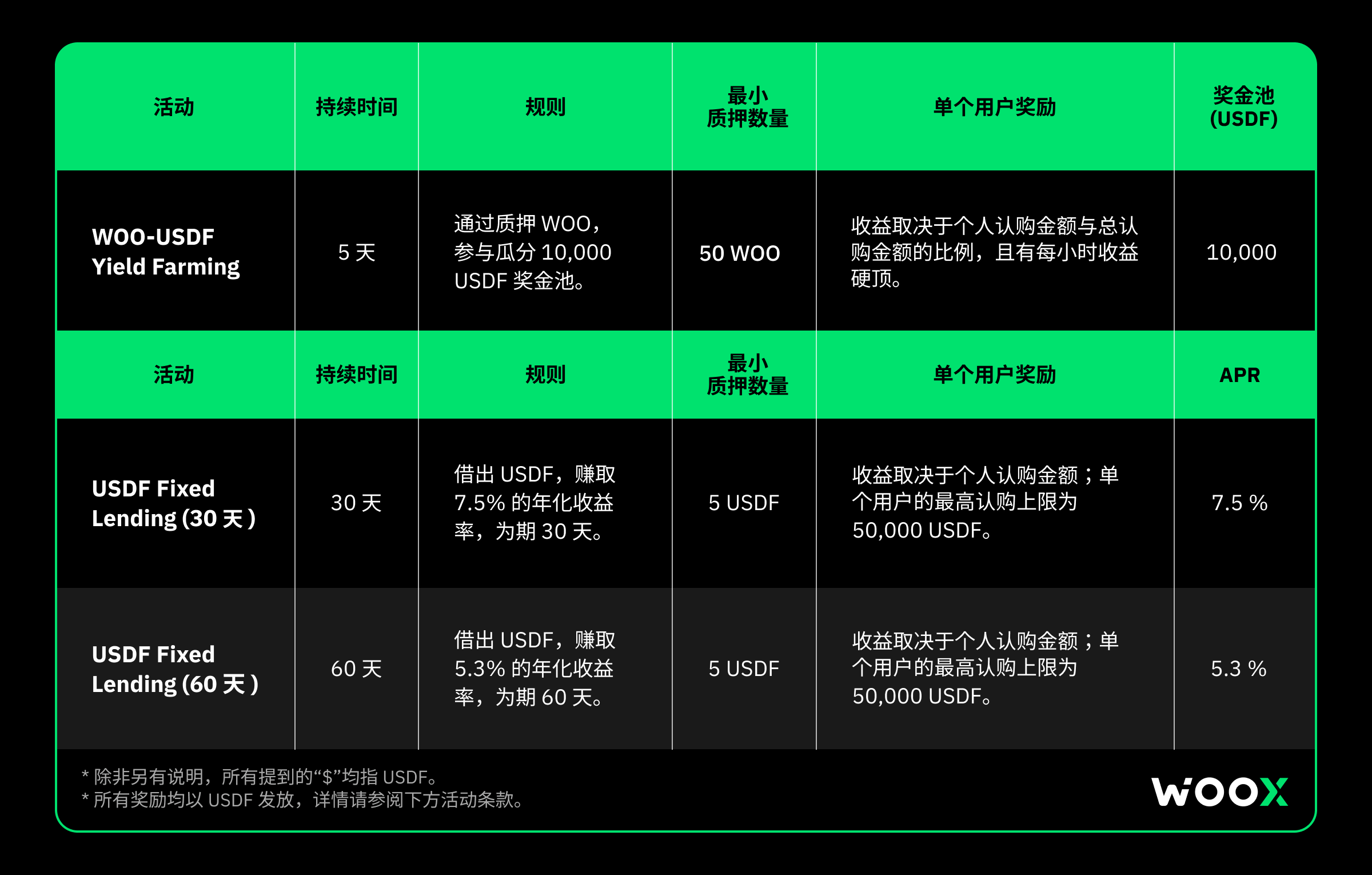 • 本次 WOO X 的 USDF 流动性挖矿总量为 10,000 个 USDF,所有收益将以 USDF 发放。