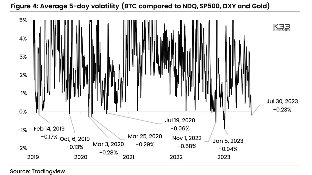 在比特幣上週跌至最近的 26,000 美元之前,CoinDesk 的報導指稱,除了與瑞波幣相關的短暫例外,讓它在 7 月中旬上漲至 31,800 美元,過去六週以來,比特幣的交易區間越來越窄,價格大多徘徊在 29,000 美元至 30,000 美元之間,尤其是過去幾天,更是很少脫離 29,000 美元至 29,500 美元區間。